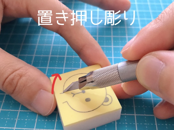 その点、置き彫りは安定感はあるものの、刃の角度も消しゴム自体の角度も決まってしまい、彫りながら刃を刺す角度を変えるのが難しくなります。
